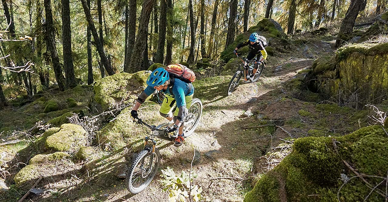 Sportlich E-Mountainbiken heisst bei vinschgauBIKE: Wir fahren die Trails gerne auch bergauf und natürlich auch bergab. Wenn du auch daran Spass findest, herzlich willkommen.