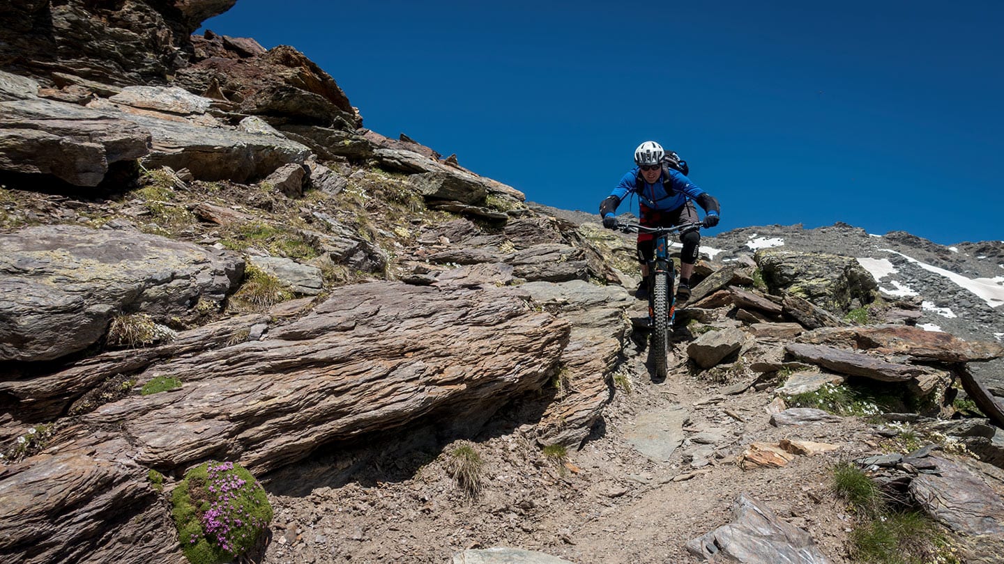 Ganz egal wie spitz die Kehren sind, ob der Trail ausgesetzt ist, die Felspassagen knifflig und steil sind. Entweder fährst du die Passagen sauber oder schiebst die Schlüsselstelle. Heldentum brauchst du in diesen Höhen nicht beweisen.