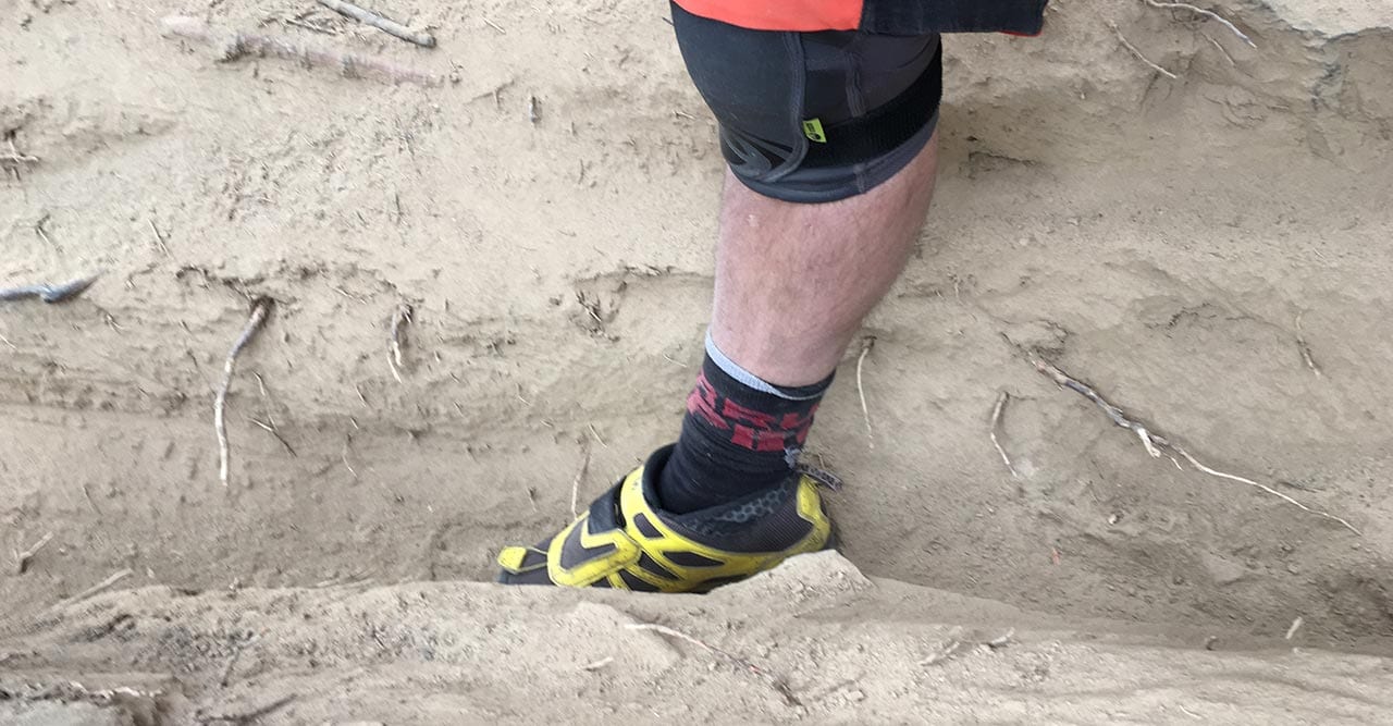 Typisch Sonnenberg! Die sandigen Böden am Sonnenberg sind des Trailbauers Graus. Es gab fast keinen Niederschlag im Winter 2015. Fehlt Feuchtigkeit im Boden, scheitern alle Bearbeitungsmethoden. Im Ziehharmonika-Verfahren legte ich mit dem Bagger einige Meter vor, dann blieben weniger als eine Stunde um den Abschnitt zu formen und zu verdichten, bevor sich der Untergrund in Form von Staub verflüchtigt.